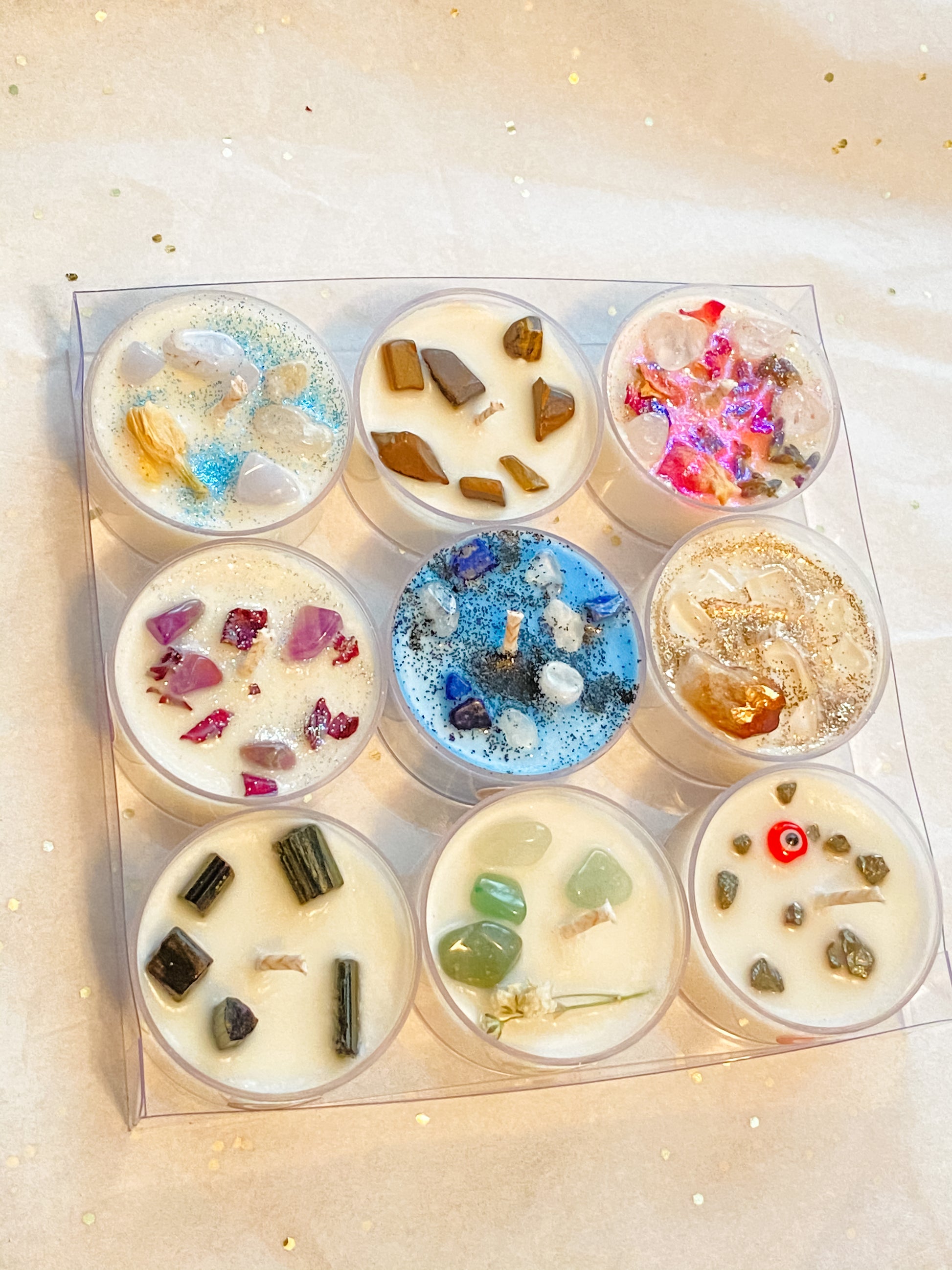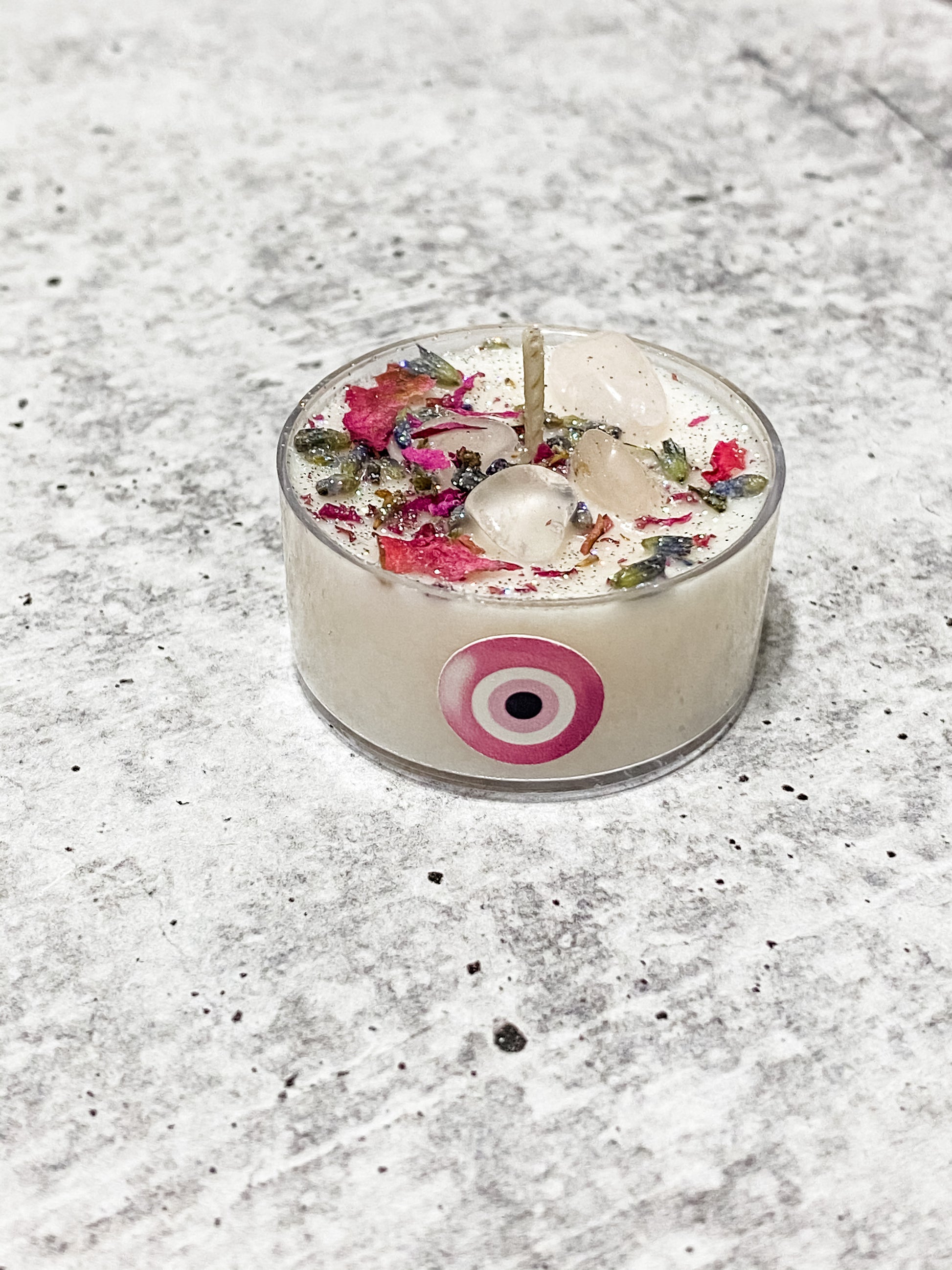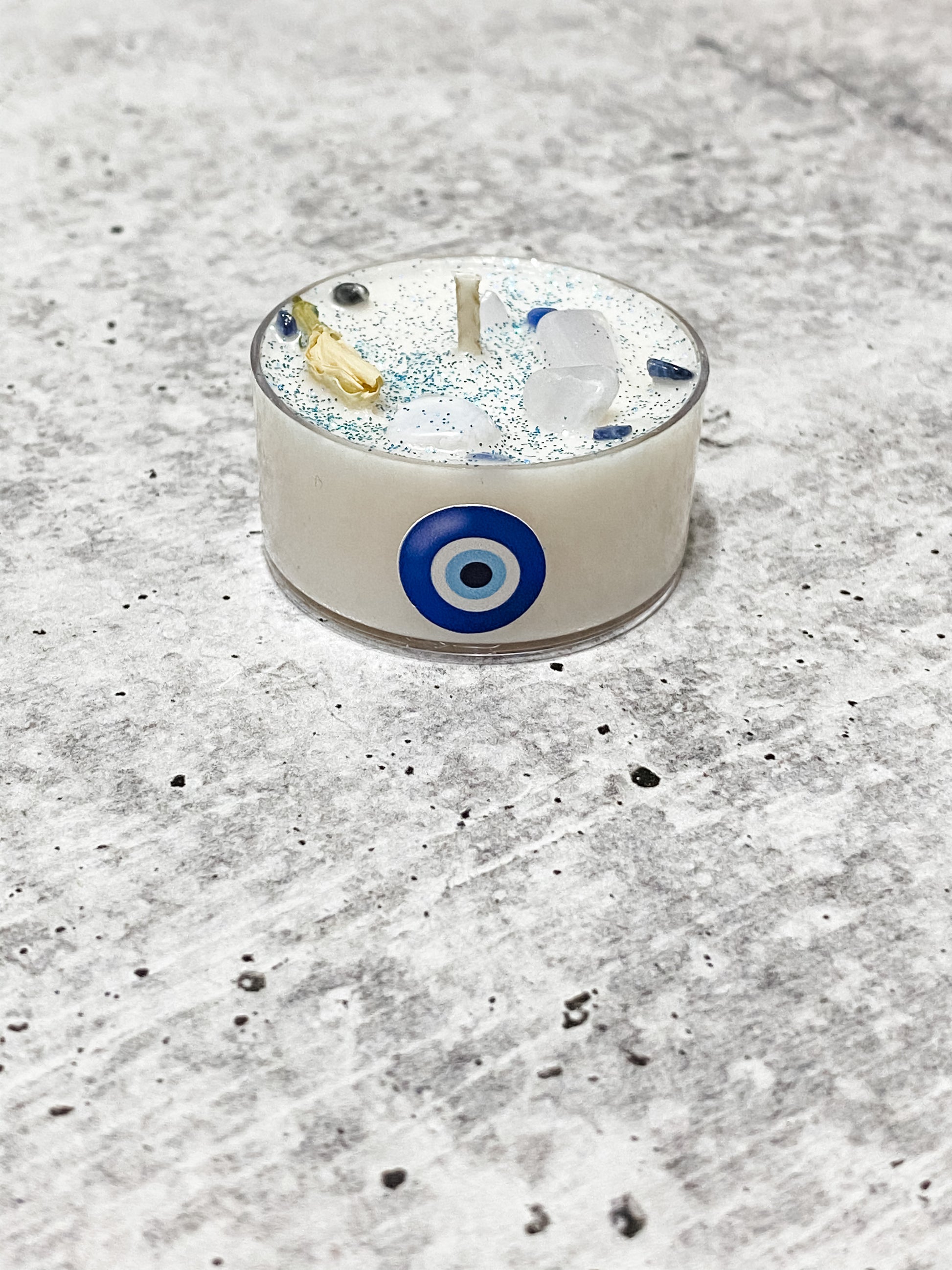 Blue tealight with white evil eye topped with moonstone and lapis lazuli for clarity & wisdom